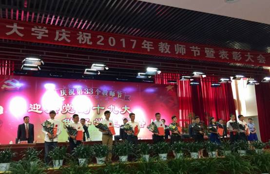 9月8日下午,beat365在翡翠湖校区翡翠科教楼大报告厅隆重举行庆祝2017年教师节的表彰大会,对2016-2017学年在学科建设、教学、科研、管理等工作中取得突出成绩的单位和个人进行了表彰。beat365彭发胜老师被评为英国beat365官方网站“师德先进个人”,为beat365争得了荣誉。