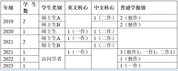 期刊论文 Zhang, Sihong & Chen, Jie. 2024. A typological study on person sensitivity in Ersu. Asian Language and Linguistics. 5.2:337-357.(源期刊高水平论文;通讯作者) Dong, Liying, Wang Yalan & Zhang, Sihong. 2024. Multilingualism in the Andes: policies, politics, power. Journal of Language and Politics. DOI: 10.1075/jlp.24053.don(源期刊高水平论文;通讯作者) Liu, Yifan & Zhang, Sihong. 2023. The essence of linguistic analysis, an integrated approach. Folia Linguistica. DOI:10.1515/flin-2023-2005(源期刊高水平论文;通讯作者) Mei, Shuqi, Wang Yalan & Zhang, Sihong. 2023. English in East and South Asia: policy, features and language in use. Journal of Multilingual and Multicultural Development. DOI:10.1080/01434632.2023.2168931(源期刊高水平论文;通讯作者) Wang, Jing & Zhang, Sihong. 2022. Cross-cultural learning: a visualized bibliometric analysis based on Bibliometrix from 2002 to 2021. Mobile Information System. https://doi.org/10.1155/2022/7478223. (源期刊高水平论文) Liu, Suya & Zhang, Sihong. 2021. A bibliometric analysis of computer-assisted English learning from 2001 to 2020. International Journal of Emerging Technologies in Learning. 16.14:12-27. (源期刊高水平论文;通讯作者) Zhang, Shuyu & Zhang, Sihong. 2019. Experimental study on a two-string lexical decision task: non-words and words. iJES. 7.4:77-84. Zhang, Sihong. 2016. Mobile college English teaching: an empirical study on an APP, English Fun Dubbing. iJET. 15.1:1-8. (源期刊高水平论文) Zhang, Sihong. 2014. Numeral classifiers in Ersu. Language and Linguistics. 15.6: 883-915.(源期刊高水平论文) 张四红,梅书琪. 2023. RCEP区域伙伴国家语言安全建设的实践路径[J]. 当代外语研究 54-64. (源期刊高水平论文) 张四红,胡爽. 2023. RCEP框架下的我国外语高等教育:现状分析与路径优化[J]. 外语学刊16-24. (源期刊高水平论文) 张四红,耿静静. 2023. 总体国家安全观视域下的边疆和谐语言生活构建[J]. 北京第二英国beat365官方网站学报 172-173. (源期刊高水平论文) 张四红,江榕,李梦媛,吴纪琛. 2023. 新中国成立以来我国外语教育政策与文化自信的互动研究[J]. 语言政策与规划研究 47-56+178-179. (源期刊高水平论文) 张四红,解丽丽. 2022. 尼泊尔的藏裔族群及藏语方言研究[J]. 中国藏学. 155.6:161-173+219.(源期刊高水平论文) 张四红,董理颖. 2022. 印度尼西亚国际中文教育的本土化路径研究[J]. 云南师范大学学报(对外汉语教学与研究版).20.6:9-18.(AMI扩展版期刊论文) 张四红,刘一凡. 2021. 中国与周边“一带一路”沿线国家的跨境语言类型及治理[J]. 云南师范大学学报(哲学社会科学版). 53.3:95-103.(源期刊高水平论文) 张四红. 2020. 尼泊尔的语言国情及中国西藏边境地带语言安全构建[J]. 南亚研究. 2020.3:39-58+157.(源期刊高水平论文) 张四红. 2020. 中国周边跨境语言研究国际学术话语权的构建[J]. 语言文字应用. 2020.2:27-36.(源期刊高水平论文) 张四红. 2020. 语言服务于国家应急管理的基础性作用研究[J]. 宿州学院学报. 35.6:40-42. 张四红. 2019. 沉浸田野矢志不渝,痴迷语言著述等身——澳大利亚詹姆斯·库克大学语言与文化研究中心R. M. W Dixon教授访谈录[J]. 常熟理工学院学报. 2019.6:79-84. 张四红, 孙宏开,王德和.2018. 尔苏语形容词的词类独立性研究[J].语言研究,38.1:107-117.(源期刊高水平论文;《中国社会科学网》全文转载) 张四红,余成林. 2017. 尔苏语的存在类和领有类动词及其类型学启示[J].民族语文,2017.3:53-67. (源期刊高水平论文) 张四红, 王轩.2017. 越西尔苏语以动词为基式的重叠式研究[J].中央民族大学学报(哲学社会科学版),44.2:163-169. (源期刊高水平论文) 张四红等. 2017. 互联网+时代的中医药跨文化传播[J]. 时珍国医国药,28.5:1277-1280. (源期刊高水平论文) 张四红. 2017. 基于对等沟通理论的英语混合式教学研究[J]. 重庆科技学院学报(人文社会科学版),2017.3:103-106. 张四红等. 2016. 中医药大学内涵建设和国际化战略[J]. 淮北师范大学学报(哲学社会科学版),37.3:129-132. 张四红,程玲. 2011. 基于Multi-Conc的英语词汇自主学习研究[J]. 现代教育技术,21.8:60-65.(源期刊高水平论文) 张四红等. 2011.基于AntConc的英语词汇教学研究——以《大学英语(精读)》课文文本为例[J]. 长江大学学报(社会科学版),34.12:93-96. 张四红. 2010. 农村大学生英语听力状况的调查研究[J]. 教育理论与实践,30.3:52-54.(源期刊高水平论文) 学生指导相关要求 课题组计划每年招收青年访问学者0-1名,学术型硕士和翻译专业型硕士各1-2名。建议青年访问学者和学术型硕士从事语言类型学和语言政策与规划方面的研究,建议翻译专业型硕士合作(或独立)翻译一本中文或英文专著,同时也鼓励学生结合自身研究兴趣进行自由探索,敬请提前通过邮件联系商谈学习方向和计划。 学生学术成果统计 结束访学青年访问学者以及已毕业学术型硕士在学期间学术成果统计: