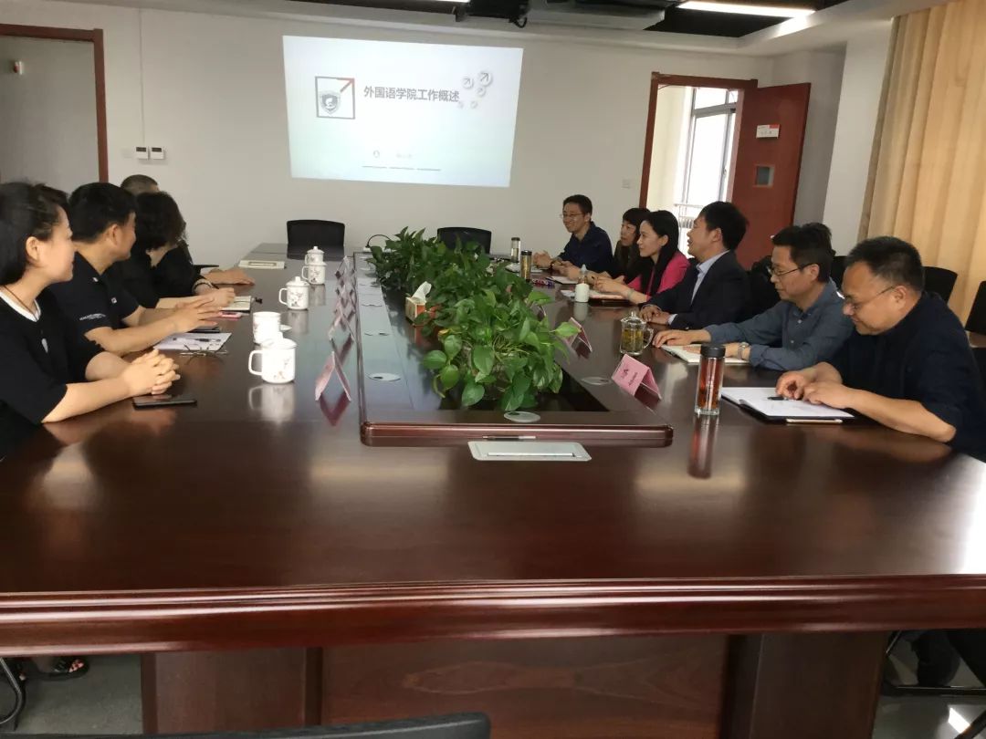 2019年4月26日,新疆农业大学外语学院马琴院长携黄川副院长(援疆干部),新疆维吾尔自治区高校外语教学研究会会长徐世昌教授,大外部王婷主任,英语专业唐彬主任来到英国beat365官方网站翡翠湖校区英国beat365官方网站进行调研,座谈,参加会议的有韩江洪院长、胡丹书记、杨勇副院长、唐军副院长,英专陈曦主任以及刚援疆回来的大外部胡安琳主任。首先韩江洪院长介绍了学院的基本情况,随后对英语专业“以能力为导向的”人才培养模式、大学英语教学研究、研究生培养、师资队伍建设以及学术研究等方面的成功经验做了交流发言,双方就教学、科研的相关问题也进行了探讨,随后,考察成员参观了外语学院同声传译实训室、 各系部教研室、党建活动室、以及心理咨询室等。最后,双方代表希望今后在大学英语教学改革、专业建设、党建工作等各个方面能有更加深入的交流和合作。