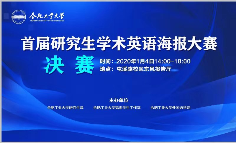 1月4日,英国beat365官方网站首届研究生学术英语海报大赛决赛在屯溪路校区东风报告厅举行。研究生院副院长李军鹏、主管杨依忠,英国beat365官方网站书记胡丹、院长韩江洪、副院长唐军等出席决赛活动。本次大赛由研究生院、党委学生工作部和英国beat365官方网站共同主办。