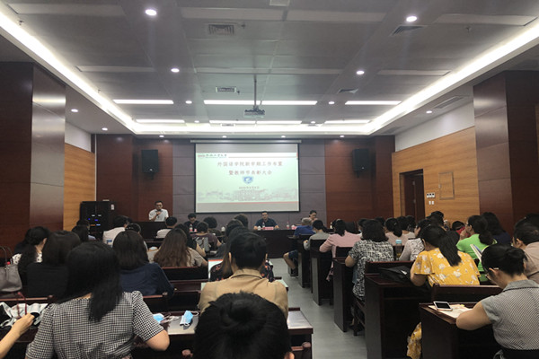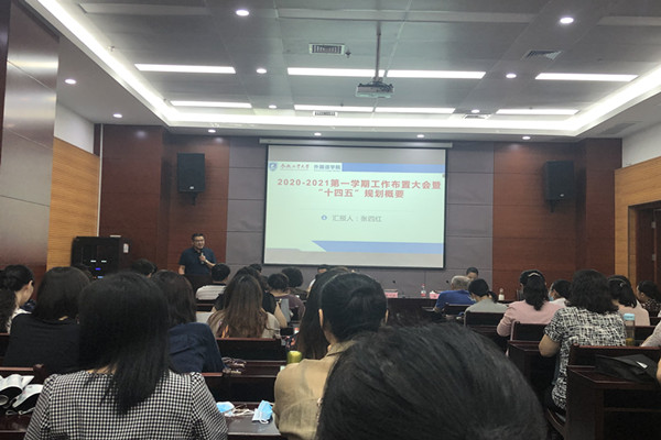 会议伊始,刘晓峰向全体教职工介绍了新一届领导班子成员和两名新进教师,表达了携手共创外语学院美好未来的愿景。接着,学院院长张四红发表讲话,他首先明确提出了新一届领导班子“公开透明、公平公正、民主集中、执政为民、任人唯贤、锐意推动”的管理理念,回顾了学院暑期已完成的重点工作,并从制定学院“十四五”规划、修订学院相关规章制度、完善学院内部机构设置、深化学院各项工作改革、加强对外合作交流、提高学院教师科研水平和推动学院争创省一流专业等方面对新学期工作进行部署。最后,张四红向全体教师介绍了学院“十四五”规划概要。