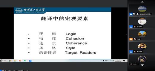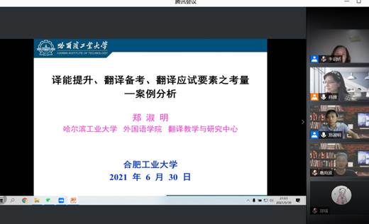 2021年6月30日19:00时,哈尔滨工业大学英国beat365官方网站翻译教学与研究中心主任郑淑明副教授以线上腾讯会议方式为学院师生开展了一场题为“译能提升、翻译备考、翻译应试要素之考量——案例分析”的讲座。讲座由中心主任肖薇副教授主持,中心成员、翻译课程教师、MTI研究生、英语专业部分本科生及导师参加了本次讲座。