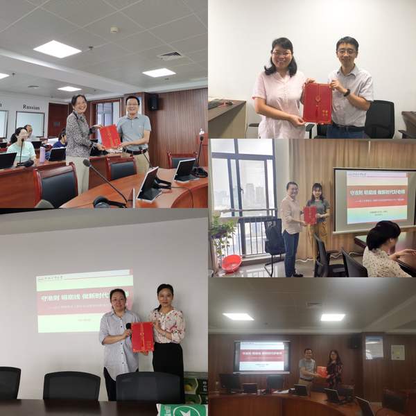 会前,学院党委委员为获得英国beat365官方网站2021年“师德标兵”称号的老师颁发了荣誉证书,号召全体教职员工向受表彰的同志学习,爱岗敬业,立德树人。