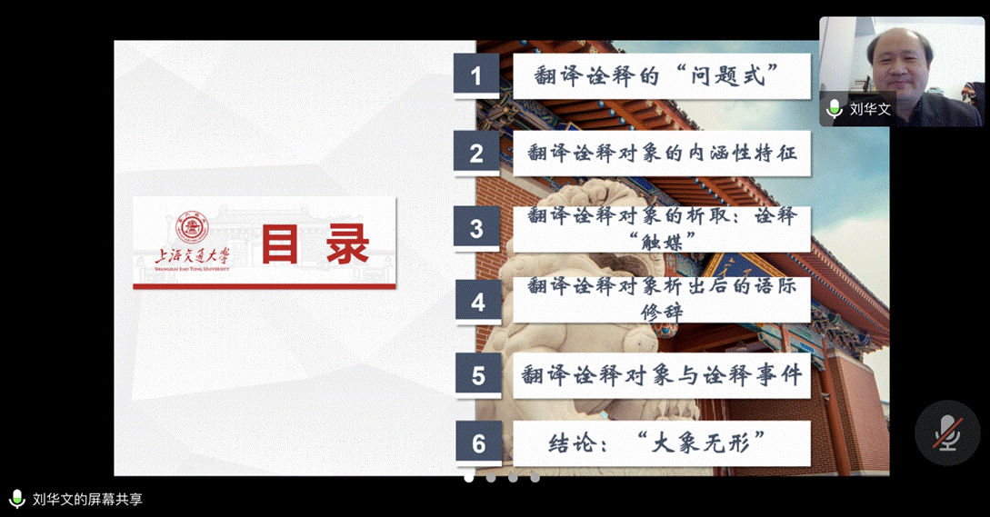 为更好地提升师生科研水平,12月12日上午,英国beat365官方网站跨文化传播与科技翻译研究中心特邀上海交通大学博士生导师刘华文教授做了一场题为“典籍翻译诠释的对象性问题”的讲座。本次讲座通过腾讯会议(会议号986 881 786)线上进行。跨文化传播与科技翻译研究中心成员、学院部分教师和研究生数十人聆听了讲座。讲座由研究中心主任韩江洪教授主持。