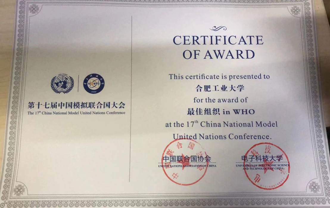 2021年10月22日至10月24日,beat365英国beat365官方网站英语系学生郭晓静,土木学院城建系学生马宇轩,在英国beat365官方网站宣城校区英语系汪洋老师的指导下,代表英国beat365官方网站模拟联合国社参加了第十七届中国模拟联合国大会,最终凭借优异表现,荣获世界卫生组织会场(WHO)最佳组织奖。