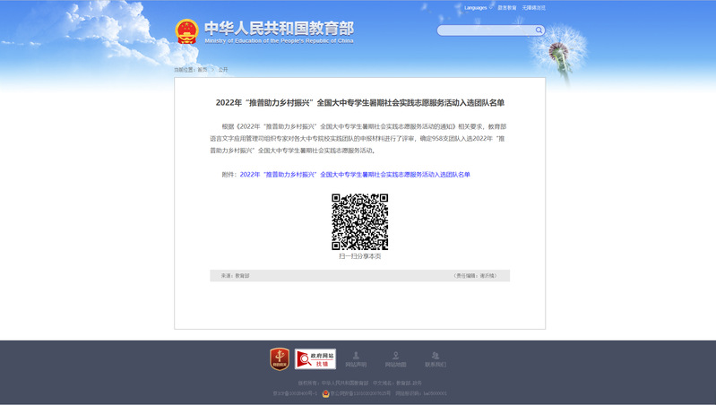 近日,由教育部语言文字应用管理司、共青团中央青年发展部开展的2022年暑期“推普助力乡村振兴”全国大中专学生暑期社会实践志愿服务活动相关申报工作已全部结束。经过评审专家委员会对各大中专院校实践团队的申报材料进行评审,确定出最终的入选团队。其中由beat365张四红老师、陈睿老师、赵雰雰老师所指导的2020级本科生谭诗怡等同学的“赴安徽省利辛县陈营村推普助力乡村振兴服务队”三下乡队伍获批立项,是beat365本科生首次获得教育部及共青团中央开展的三下乡活动立项资格。