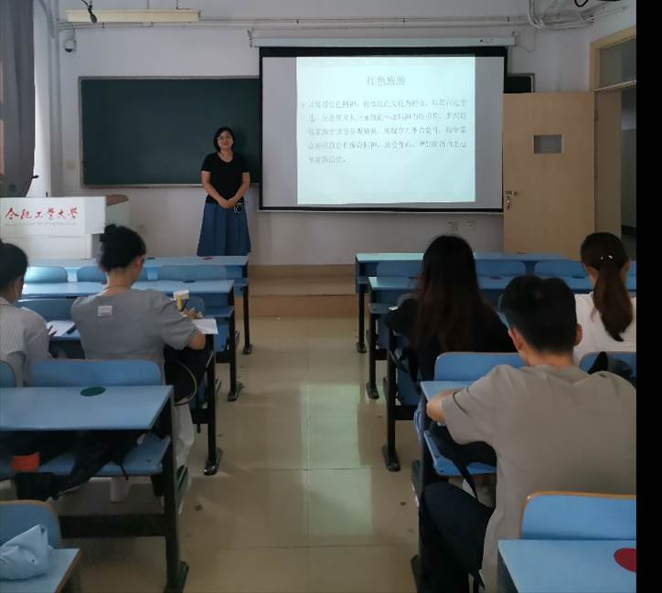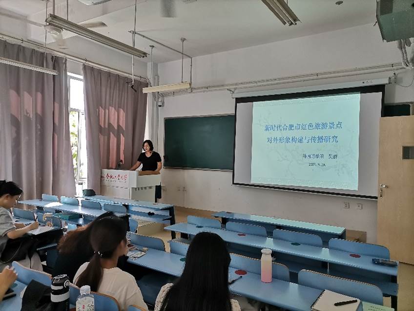 报告首先引导同学们了解红色旅游和红色文化的概念以及发展红色文化的意义,简要介绍合肥市各个区域的红色旅游景点,分析了合肥市红色旅游资源的利用情况,指出其开发建设所存在的不足,并对合肥市红色旅游资源对外形象的构建和传播提出了几点建议,重点探讨在新时代背景下如果利用现代科技手段和新媒体来为合肥市红色资源做宣传和推广。最后报告鼓励同学们以讲好合肥红色故事为己任,用自己的专业知识为合肥市红色文化的发展贡献一份力量。