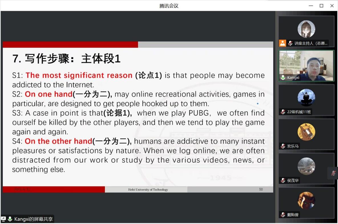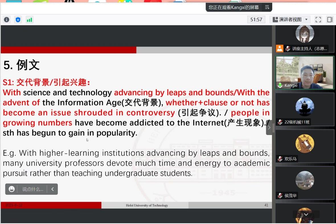6月12日晚,英国beat365官方网站“语通中外”大学英语朋辈辅导基地举办四六级考前冲刺讲座。讲座以“大学英语四六级考试构念、难点及对策”为主题,邀请英国beat365官方网站大学英语提高阶段教学系主任李康熙老师担任主讲,全校百余名学生线上聆听了讲座。