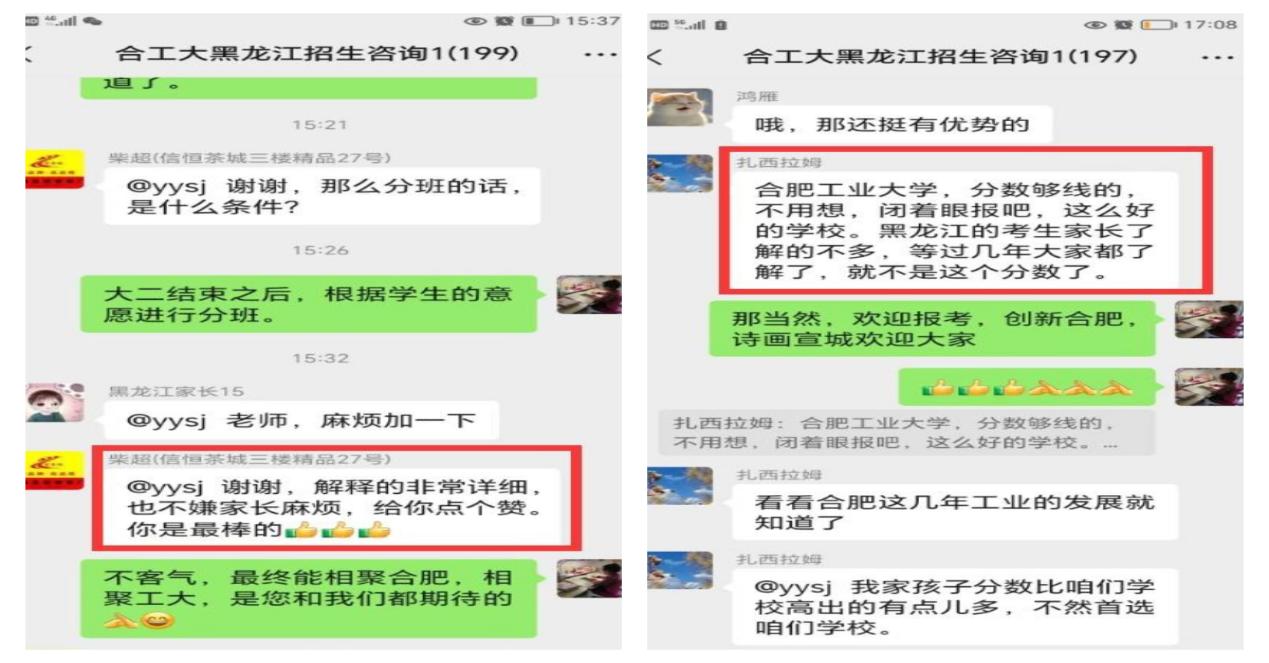 学院利用招生热线和社交平台,主动做好答疑服务,实现多渠道答疑平台同频共振,全程在线。学院发布招生咨询热线,公布两省一市3位招生负责人手机号码,第一时间解答考生和家长的疑问。学院共组建官方QQ咨询群6个,微信群2个,在线转发学校详情、招生政策等,解答考生及家长疑惑,实现新媒体平台的全天响应。周到、耐心地服务得到家长的高度赞扬。