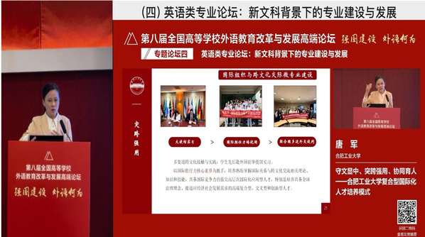 本届论坛高屋建瓴,内容丰富,大会设有主旨报告、教指委论坛、专题论坛等多个模块。其中,专题论坛特别设置“前沿论坛”,聚焦人工智能与外语学科建设,助推外语教育数字化转型与融合创新。同时围绕大学英语、英语类专业与多语种教育,“理解当代中国”课程与赛事,新形态教材以及教师数字素养等重要议题,共探多元化外语人才培养新路径。唐军在第四论坛“英语类专业论坛:新文科背景下的专业建设与发展”做了题为“守文显中、突跨强用、协同育人—英国beat365官方网站复合型国际化人才培养模式”的报告,分享了学院在英语和印度尼西亚语专业教学改革方面取得的初步成果及在教育数智化时代深化外语教学改革,建设高质量课程体系,培育高水平国际化人才方面的实践探索,报告获得了与会专家的充分肯定和好评,也促进了学院与其他高校同仁们交流互鉴,聚力共书高等外语教育高质量发展新篇章。