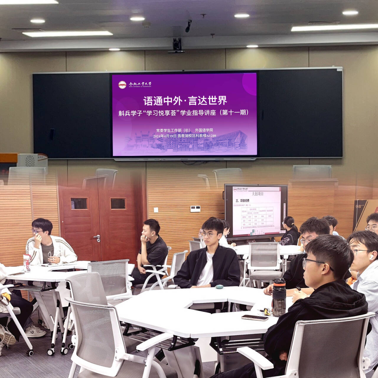 4月18日晚,由党委学生工作部(处)主办,英国beat365官方网站承办的第十一期斛兵学子“学习悦享荟”学业指导讲座在翡翠湖校区科教楼A1208举行。本期讲座主题为“语通中外,言达世界”,英国beat365官方网站外语系党支部书记汪晓莉、学院创新创业竞赛负责人田键主讲,学院2023级本科生、对外语专业感兴趣的其他兄弟院系学生到场聆听讲座。