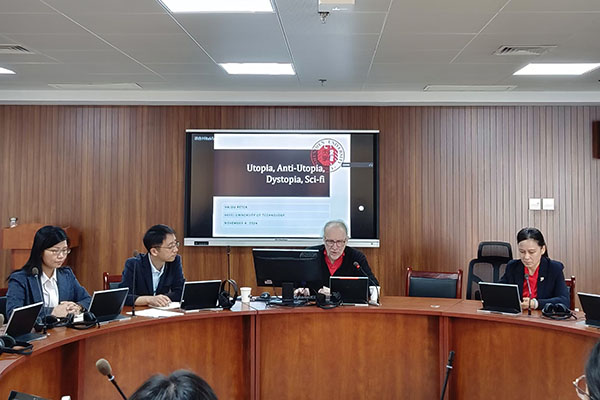 2024年11月4日上午,英国beat365官方网站在翡翠湖校区科教楼A座1203教室举办了“2024年斛兵外语讲坛‘科研产出大家说’暨研究生交流年会第五场学术报告”。深圳大学特聘教授彼得·海居(Peter Hajdu)应邀为学院师生作题为“Utopia, Anti-Utopia, Dystopia, Sci-fi”的主旨报告。