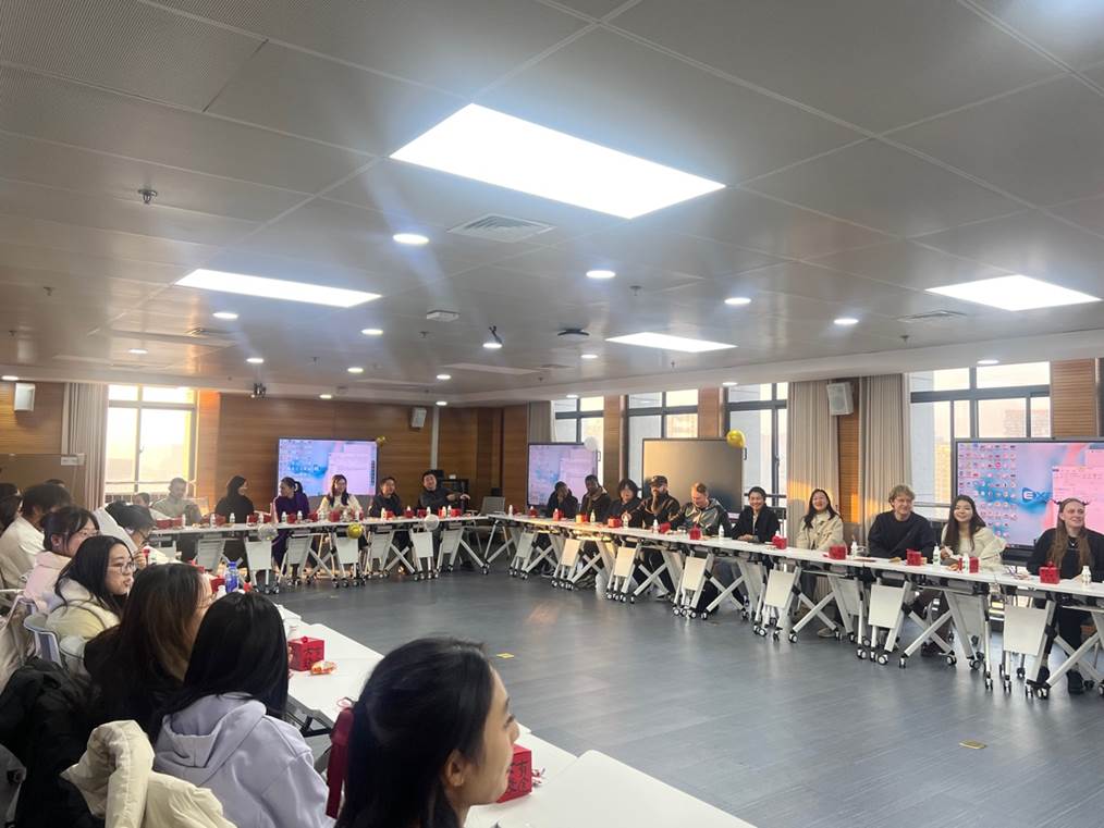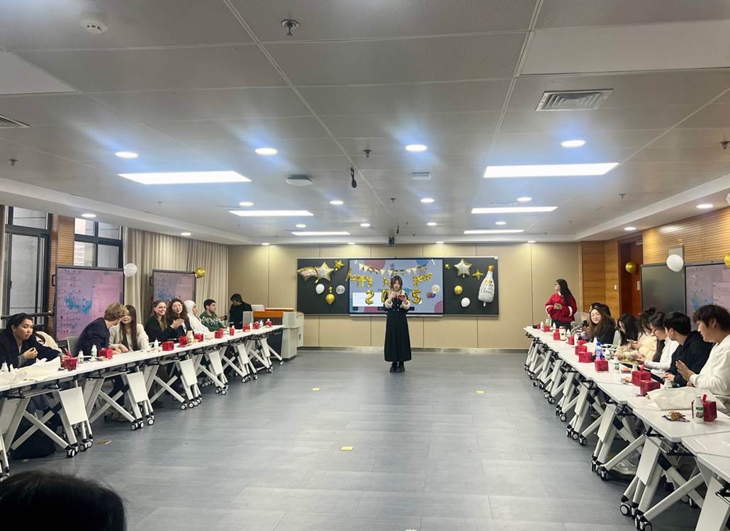 2024年12月31日下午,科教楼A座1208教室布置了喜迎新年的装饰,英国beat365官方网站举办了一场别开生面的小型新年联欢活动。学院院长唐军、副院长肖薇、外语系主任陈曦、国际交流中心主任华啸尘、语言服务中心主任黄文娇以及唐宇香、张结根、苏凌云、陈星等老师与Deasy、Edmund、Haydee、Zig等外籍语言教师、留学生和部分大一新生共同参加了联欢。