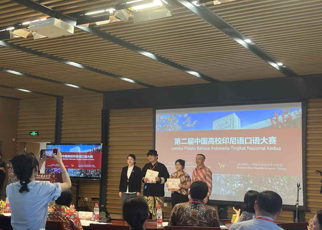 2025年4月26至27日,由北京外国语大学主办及印度尼西亚(以下简称“印尼”)驻华大使馆协办的“纪念中国与印度尼西亚建交75周年暨第二届全国高校印尼语口语大赛”在北京圆满落幕。该赛项以“数智时代的印尼语学习”和“弘扬万隆精神,构建中印尼命运共同体”为主题,分为低年级组和高年级组两个赛道。此次比赛由印尼驻华大使馆公使衔参赞、教育参赞、一等秘书和主流媒体的国际传播专家等担任评委会成员,经过激烈的竞争,学院印尼语专业2023级学子陈红斩获低年级组最高奖一等奖,2022级学子周芋君和钱梦媛分别荣获高年级组二等奖、三等奖。