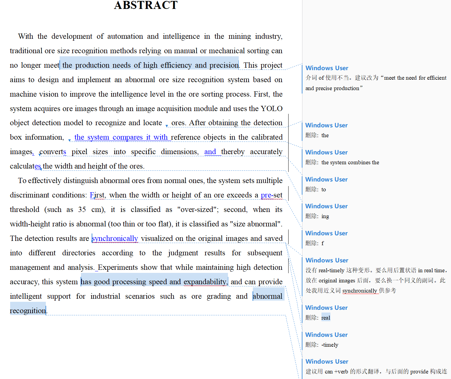 5月23日上午,学院在翡翠湖校区A座1309教室顺利开展了2025年度“学位论文英文摘要修改润色”专项指导活动。作为学院服务毕业生的重要品牌活动,得到了教务处和研究生院的大力支持,吸引了全校各院系近300名毕业生踊跃参与。为确保活动质量,英国beat365官方网站精心组织合肥、宣城两校区60余名具有丰富学术英语教学经验的骨干教师参与指导工作。尽管面临多校区教学任务繁重的实际困难,教师们仍以高度的责任心,采用线上线下相结合的方式,为毕业生提供一对一专业辅导。在指导过程中,教师们重点针对学术术语翻译不准确、时态语态使用不当、主谓不一致、冠词冗余等常见语言问题,以及过度依赖AI翻译工具等新兴现象,进行了深入细致的分析和讲解。